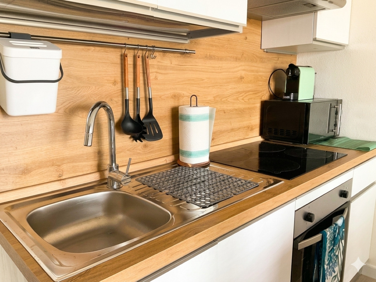La cucina americana, con piano cottura a induzione, è completamente attrezzata con frigorifero, congelatore, stoviglie, utensili da cucina e tutto il necessario per preparare deliziose pietanze. Godetevi i pasti nella zona pranzo o rilassatevi sul terrazzo privato, ammirando le viste panoramiche circostanti.